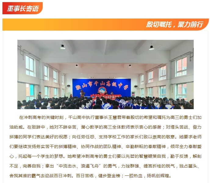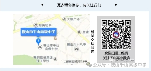 招生專(zhuān)欄MORE>> ■鞍山市千山高級(jí)中學(xué) 激爆潛能 追求卓越 低進(jìn)高出 優(yōu)進(jìn)精出 ■鞍山日?qǐng)?bào)、北方晨報(bào)記者報(bào)道---千山高中因材施教見(jiàn)成效